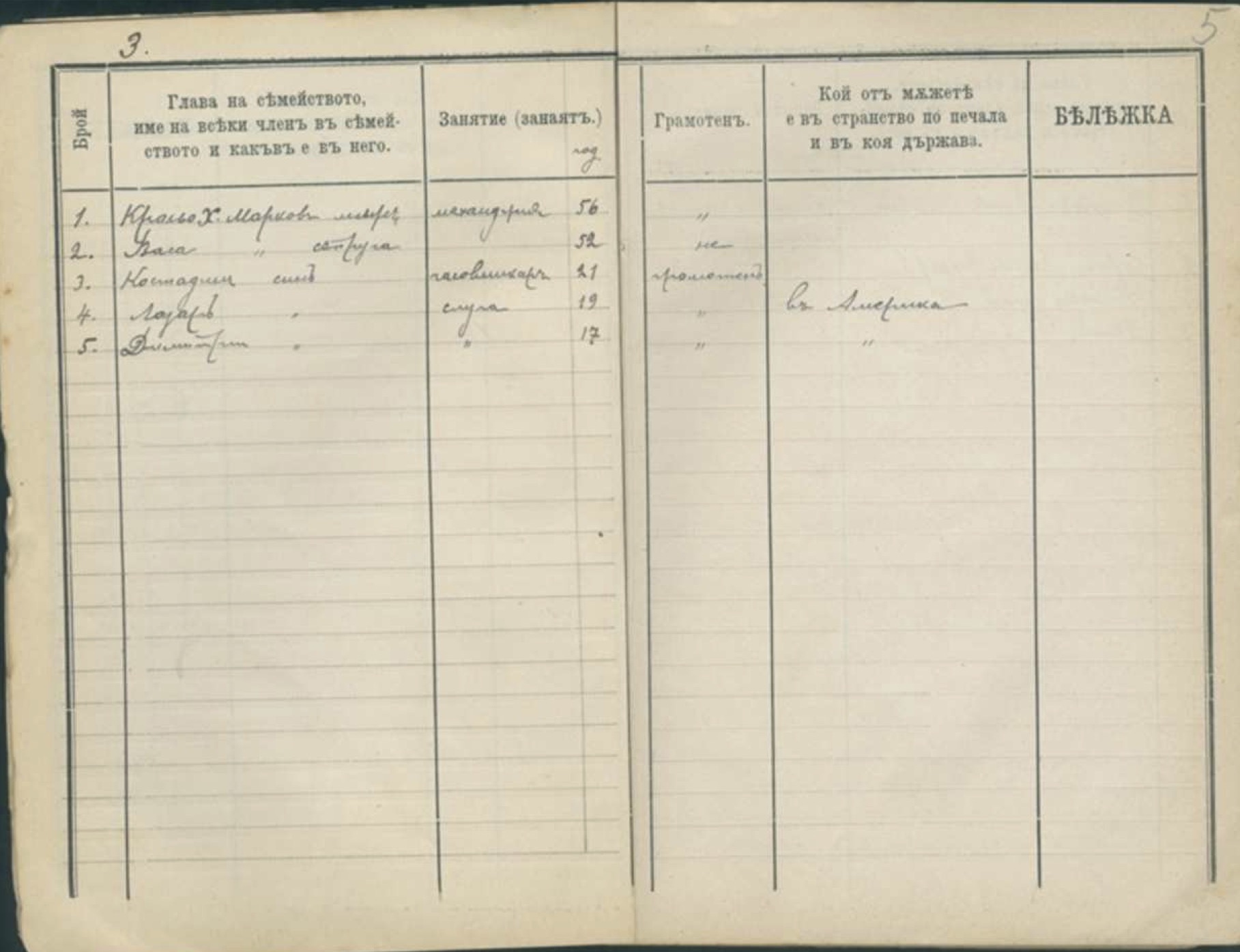 Although often titled венчила в енорията (parish marriages), these registers function in practice as comprehensive household and family lists (Libri status animarum), systematically introduced across Exarchate jurisdictions in Macedonia and adjacent regions during the early 20th century. Their format closely resembles a community census. Entries are organized hierarchically by vilayet → eparchy → kaza (district) → settlement, and typically record the head of household, all family members and their roles within the household, approximate ages, occupations or crafts, literacy, seasonal or permanent labor migration (pečalba), and additional remarks on residence, mobility, or special circumstances. This structure makes the registers exceptionally valuable for reconstructing household composition, social status, and migration patterns at the micro level.