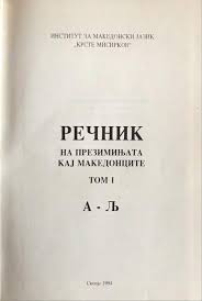 The Речник на презимињата кај Македонците (Dictionary of Surnames among Macedonians, Skopje, 1994), published by the Institute for the Macedonian Language “Krste Misirkov” and edited by Trajko Stamatoski with collaborators Marija Korobar-Belčeva, Marinko Mitkov, and Olga Ivanova, is the most comprehensive scholarly reference on surnames among ethnic Macedonians. Designed as both a linguistic and demographic study, it represents a fundamental starting point for genealogical research in North Macedonia.